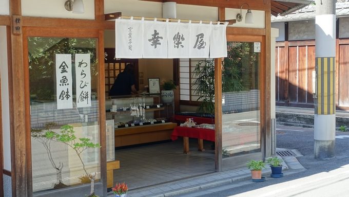幸楽屋さんというお店です。金魚鉢と並んで、わらび餅も貼られてます。わらび餅もとてもおすすめです。やわらかいわらび餅の中に、これまた少し柔らかいあんこがタップリ入ってます。わらび餅も暑い時期にはとてもおいしいのですが、今回は金魚鉢を紹介します。