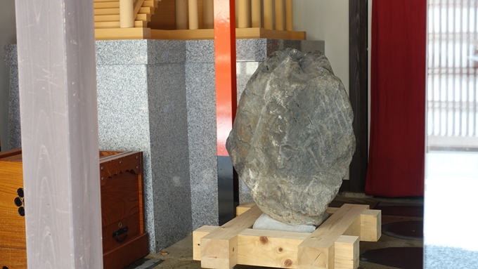 以前は民家の壁に埋め込まれていたのですが、今は建物の中に入りきれいになってます。前にカエルの石像があります。将門の首は、ここから関東まで飛んで帰ったとの言い伝えから、カエル=帰る とかけています。