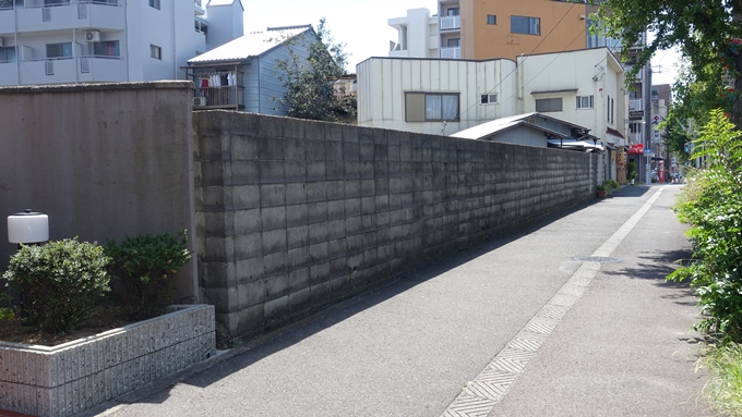 西大路通りから刑場趾を見ると、コンクリートブロックで遮断されています。白く角ばった二階建ての建物の向こう側が紙屋川です。このコンクリートブロックの中が「西土手刑場跡」です。