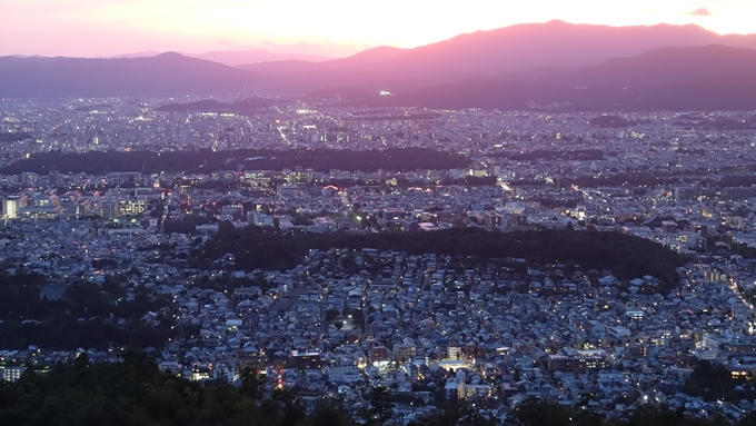 ほぼ日が暮れました。真ん中の黒い部分は京都御苑です。その手前の二つは北(右手)が吉田山で南(左手)が金戒光明寺や真如堂です。