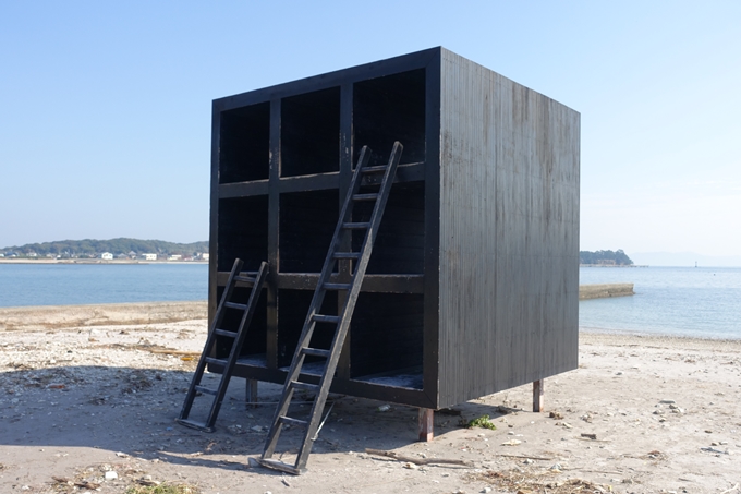 先ほどの「紫の砂浜」から戻ってきて、東港を通り過ぎるとすぐに「イーストハウス」というアートオブジェが、大島に向かう桟橋の途中にあります。