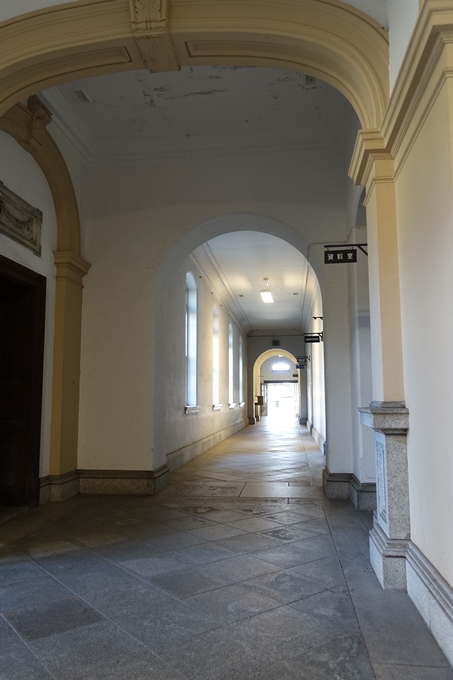 ホールから左右に廊下が伸びていて、中庭側に執務室が並んでいます。上の画像は玄関ホールから東を見た画像です。