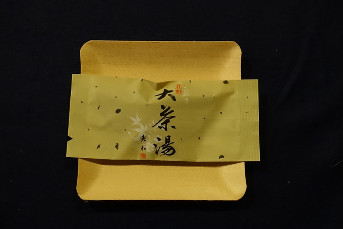 これがそのお菓子の、「北野大茶湯(きたのだいさのえ)」です。「北野大茶湯」は、天正15年10月1日(1587年11月1日)に北野天満宮境内において関白太政大臣・豊臣秀吉が催した大規模なお茶会です。御土居のもみじに合わせた名前のお茶菓子になってるんですね。せっかくですが、時間があまりないので、お茶菓子は帰宅してからゆっくりいただくことにします。温かいお茶も無料ですので、茶店でゆっくりとするのもいいですね。