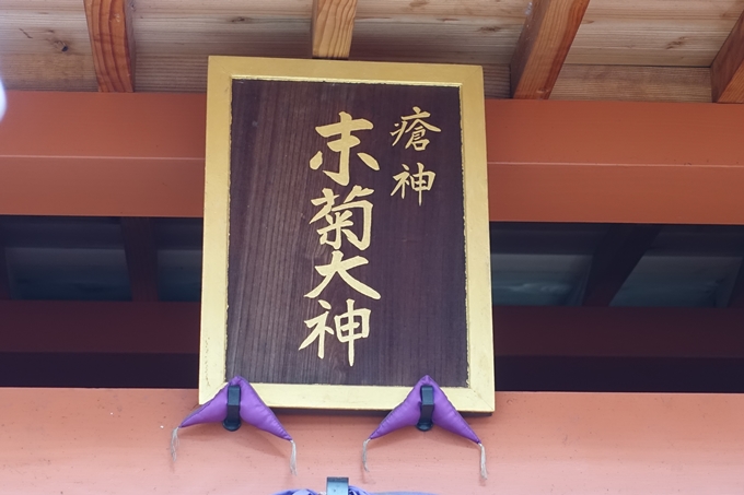 神額には「瘡神 末菊大神」とあります。「瘡神」とは「出もの腫れもの」の神様で、京都では「くさがみ」と呼ぶことが多いです。他の地方では「かさがみ」と呼んでいるようですね。
