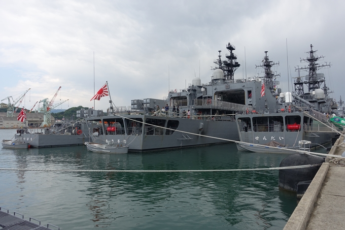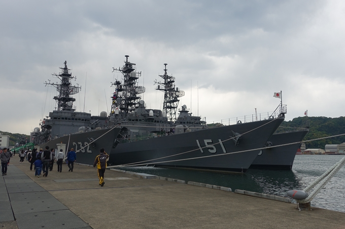 護衛艦「せんだい」「あさぎり」「まつゆき」が並んでいます。「せんだい」から甲板に上がって、お隣の「あさぎり」の甲板まで一般公開で乗船できます。