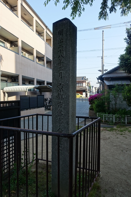 どこにでもあるような、あまり広くはない児童公園です。見ての通り、公園の真ん中にど~んと立ってます、「羅城門遺址」の石票。