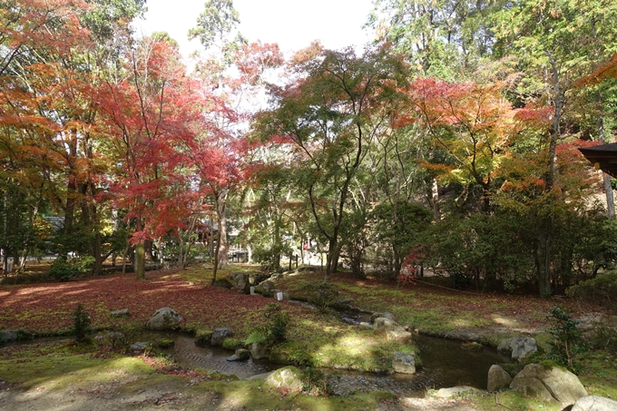 「上賀茂神社」の次は、もう少し東にある「大田神社」に行きました。社家の家並みを歩いて10分ほどで到着します。「大田神社」までの道沿いには昔からの家が多く、お庭もきれいにされていて、塀や垣根越しに紅葉したもみじが覗いています。