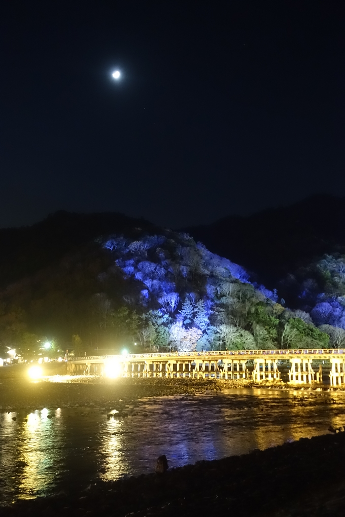 今回の「嵐山花灯路」で一番インパクトを感じました。モンキーパークのサルたちは嵐山の青いライトアップ、どんな風に感じて見てるんでしょうね。