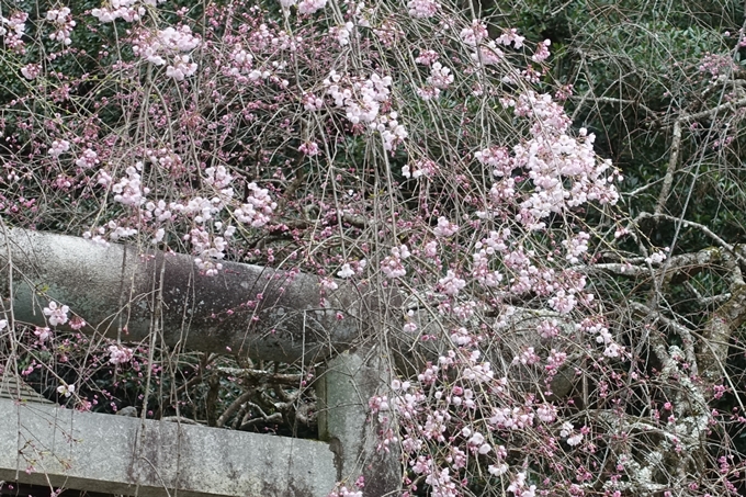 実は「本殿」に向かって右側に生えているのが「枝垂れ梅」で、よ~く見ると、まだ濃いピンクの花が少し残っています。