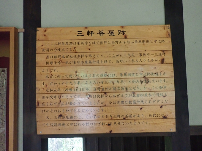 吊り橋を渡るとすぐ「三軒茶屋跡」の休憩所です。昔は名前の通り三権のお茶屋さんがあったそうです。この地は、「果無峠」を経て熊野と高野山を結ぶ「果無街道」と「中辺路街道」の分岐点でした。昔は「熊野本宮大社」の参拝を終えると「果無街道」を経てそのまま「高野山」に参る人も多かったそうです。