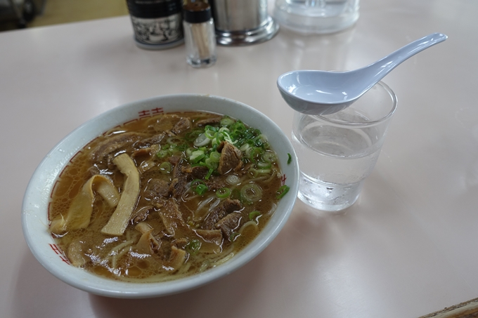 中華そばの「中盛肉入」です。いきなり大盛りを頼んで、でっかいのが出てくるとビビるので、とりあえず中盛にしました。これなら女性でも大丈夫ですね。ラーメンの中に蓮華を入れずにコップの上に蓮華を置かれました。