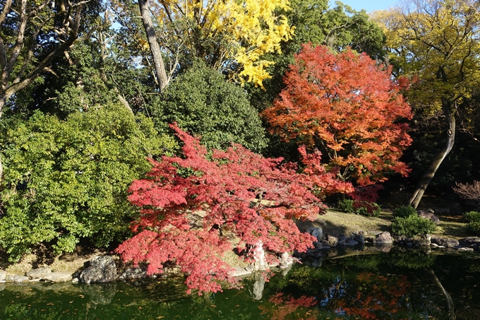「拾翠亭」のもみじ。前回は日陰だったのでくら~い色でしたが、今回は斜光が当たっていい感じです。「九條池」の反対側から撮っているので、ちょっと解像度が悪いです。