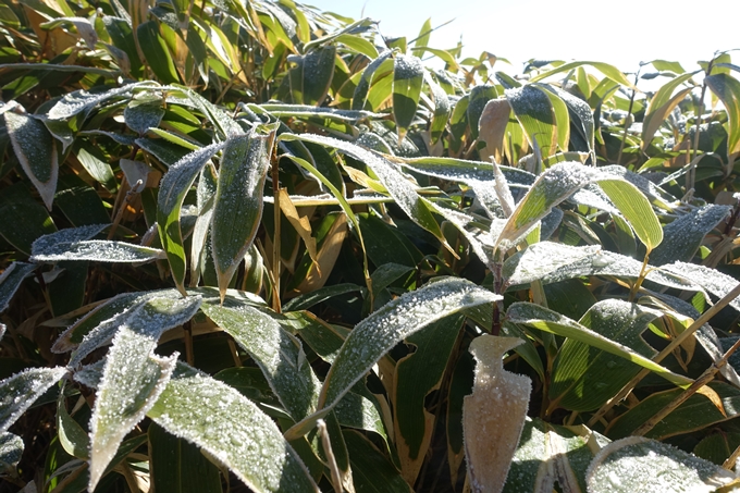 笹の葉っぱもよく見ると、霜が降りたようになっていますね。夜間はとっても寒いのでしょう。