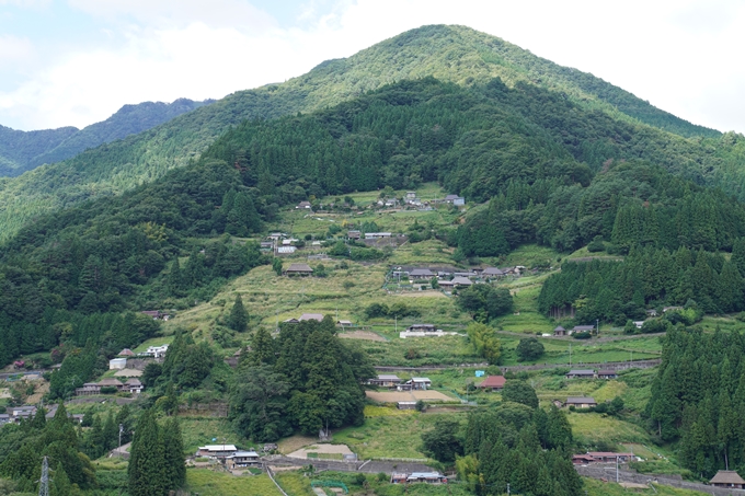 さて、雲が本題ではなくて、その下に広がる集落が本題です。私が来たのは「落合集落展望所」という、反対側の山にある集落を展望できる高台です。上の画像は雲で少し暗くなりましたが「落合集落」という急な山の斜面に広がる集落です。