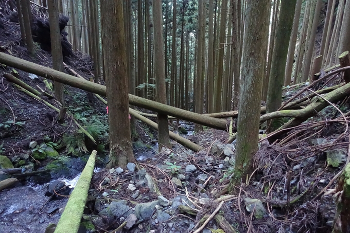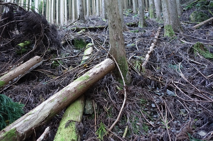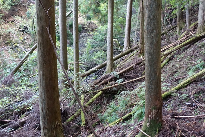やっと抜けました。前回の「岩ヶ谷」の倒木に比べるとそんなに苦労はないですが、やはり体力を奪われます。やっと抜けたんですけど、少し行くとまた倒木で、今度は右側の杉林の斜面を登ります。もうね、斜面というより、むっちゃ壁。