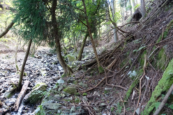 渓流の左側、倒木で荒れてますが獣道が続いています。