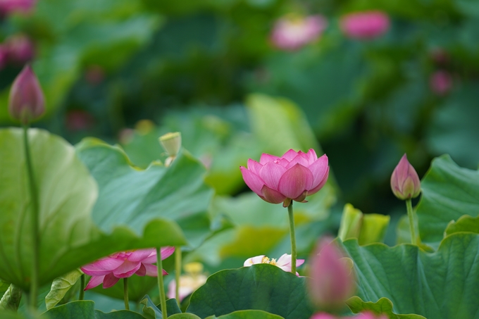 今年も繁茂してます。真ん中に橋でもあると写真が撮りやすいんですけども、観光用のハスではないので岸辺からしか撮れません。