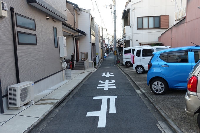 「下立売浄福寺」の交差点から「承明門」の方(西)を見てみました。某酒屋さんが見えますね。「下立売通り」は一通の狭い通りです。恐れ多くも「前庭」を横切ってます。