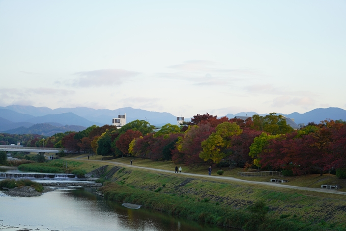 通勤経路で今一番きれいなのは鴨川の堤防沿い。もみじはないのですが桜の赤をメインに色々な木が紅葉を始めています。んで、写真を撮るのは「丸太町橋」の上から。
