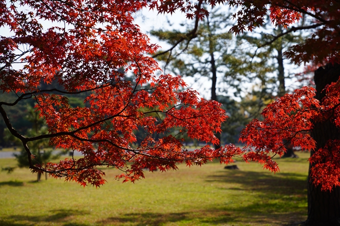 つーことで、11月20日(土)は朝から嵐山を回ったのですが、まだ足りないということで、もっと紅葉を見に行くことになりました。でも、どこも観光客でいっぱいでしょうから、できるだけ空いているところということで、市バス1本で行ける「御所」に行くことにしました。「御所」なら人が多くても間隔十分に取れるだろうし、ちょっとでも感染のリスクは低いと思われるので、市バス「嵐山」のバス停から93系統で「烏丸丸太町」まで一気に移動です。