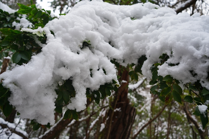 なだらかな下り。 このもう少し先で大きく滑ってしまいました。斜面に落ち葉が積もっているところがあって、通常時でもよく滑る所なんですけど、雪で全然見えてないので2mぐらい滑空したんですけど、なんとかこけずに踏ん張りました。心臓バクバクです。ま、こけても怪我はしないでしょうけど、雪が入って濡れると後が気持ち悪いですからね。