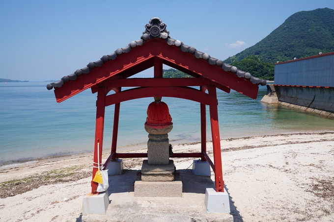 で、どんどん走って行くと砂浜にお地蔵さん。一瞬「島ごと美術館」かと思ったのですが、本物のお地蔵さんでした。