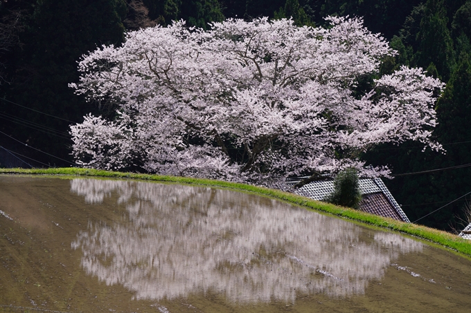 お気づきの方もいらっしゃるかもしれませんが、田植えの時期ではありませんよ。全然早いですよ。水を張ってるのはこの田んぼだけ。周囲の田んぼはカラッカラ。たぶん持ち主の方がわざわざこの桜のために水を貼ってくれているようなのです。