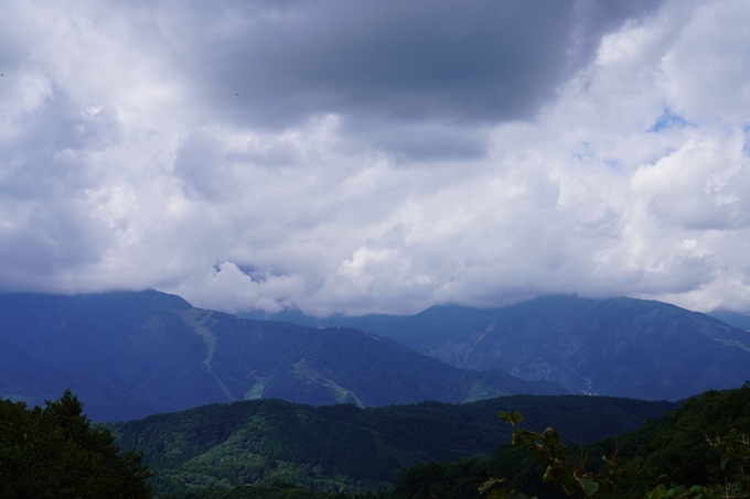 鬼無里(きなさ)でお蕎麦をいただいた後、小川アルプスラインと名付けられた道を走って「小川村アルプス展望広場」に到着しました。でも、ご覧のとおり、北アルプスの山々は雲の中...