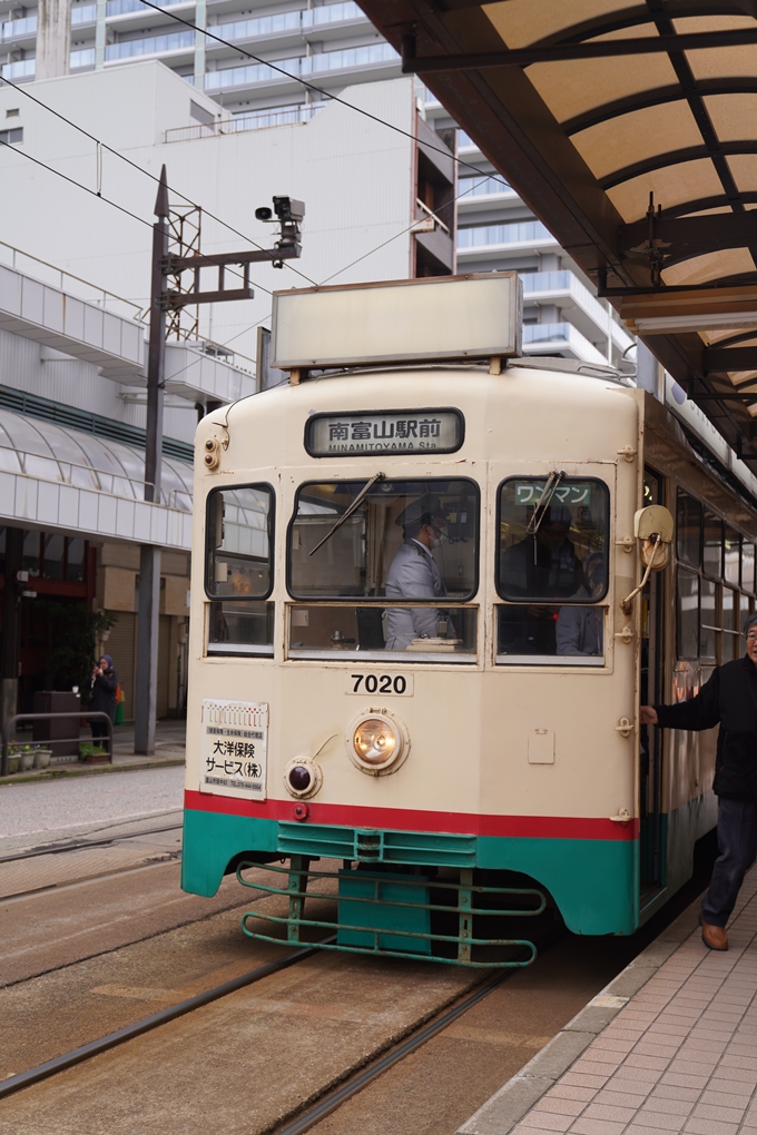 走ってる路面電車。昔、京都市内にも市電が走っていたのでとても懐かしいです。